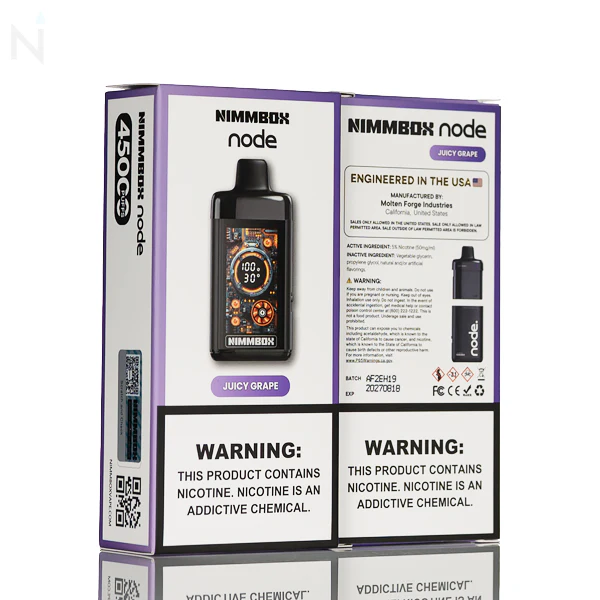 Experience the NimmBox Node 45K Puffs Disposable Kit, featuring a smart LED indicator display, dual mesh coils, adjustable airflow, removeable/replaceable pod, and up to 45,000 puffs.