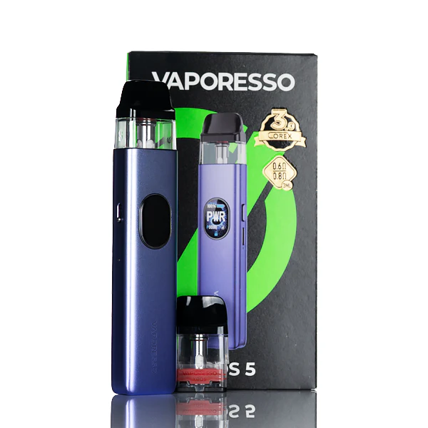 Vaporesso XROS 5 Pod System, featuring a 1500mAh battery, 5-30W output range, 3mL pod capacity, constructed out of an aluminum alloy for lightweight durability.